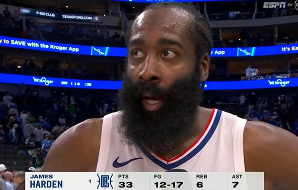 JRS直播网讯 北京时间4月29日,快船G4客场116-111击败独行侠,总比分2-2两队打进天王山,哈登打出疯狂一战,全场出战40分钟,17投12中、三分5中4轰下33分7助攻6篮板,大秀后撤步三分和抛投两大杀招,末节8中6独砍15分统治比赛,拒绝31分大逆转。