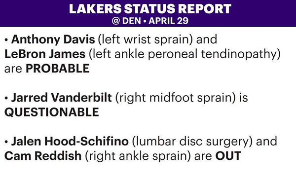 JRS直播网讯 北京时间4月29日,湖人官方正式公布G5伤病报告,詹姆斯和浓眉大概率出战,范德比尔特出战成疑,有望G5复出;掘金球星穆雷出战成疑。