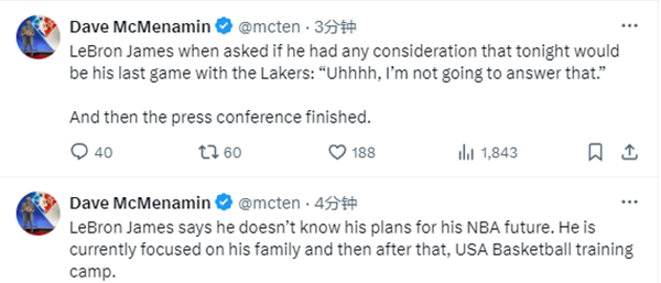 当被问到这是否是自己作为湖人球员的最后一场比赛时,詹姆斯表示:“额,我不会回答这问题,谢谢!
