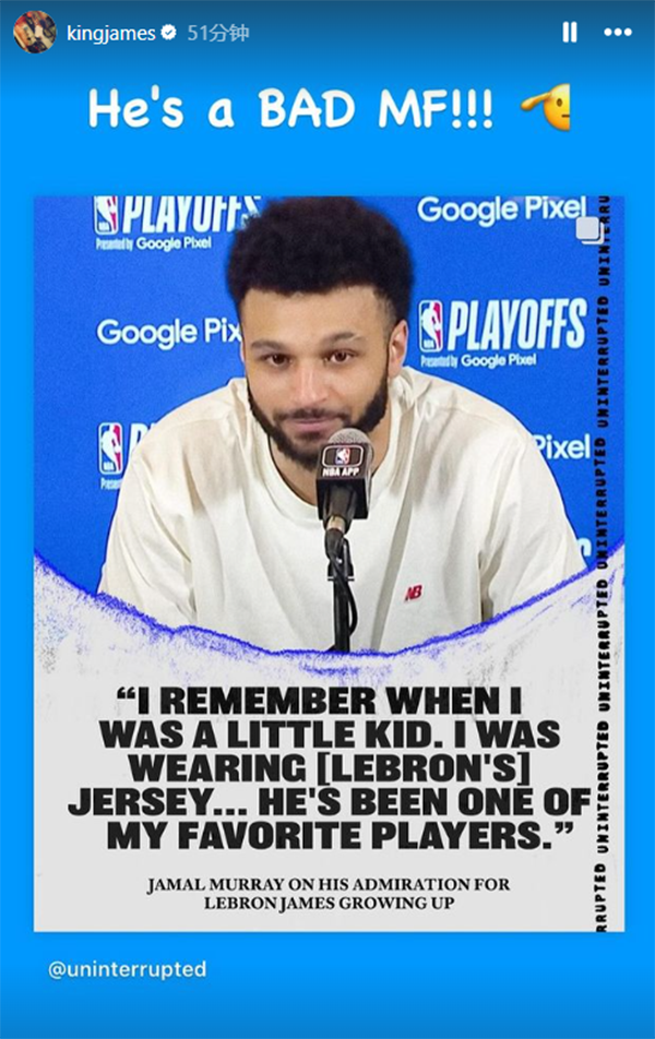 不久前,詹姆斯通过社媒预告个人播客节目,直言:太棒啦,明天我们就回归了。詹姆斯转发穆雷G5赛后夸赞自己的言论,配文写道:他真的是个坏家伙(致敬)!