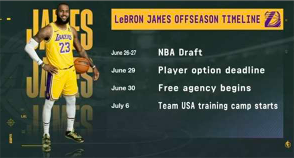 今日,ESPN列出了一份詹姆斯的休赛期时间表——6月26-27日NBA选秀大会,布朗尼已经决定参加选秀;6月29日球员选项执行截止日,目前詹姆斯拥有价值5140万美元的球员选项;6月30日自由球员市场开启;7月6日美国男篮训练营开始。