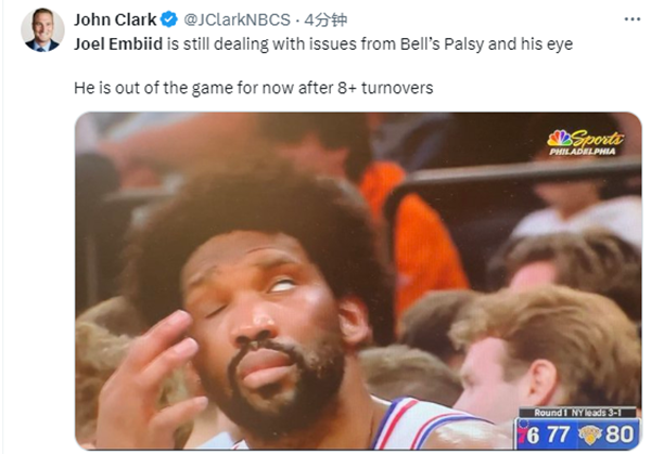 末节,马克西连得5分,巴图姆命中三分,76人8-2反超5分,随后恩比德三分打铁以及连续失误,被尼克斯打出8-0攻势;暂停回来纳斯换下恩比德,费城记者报道,恩比德仍在处理面瘫的病情;之后阿努诺比中投,哈里斯回应2分,布伦森2+1,纳斯赶紧换上恩比德。