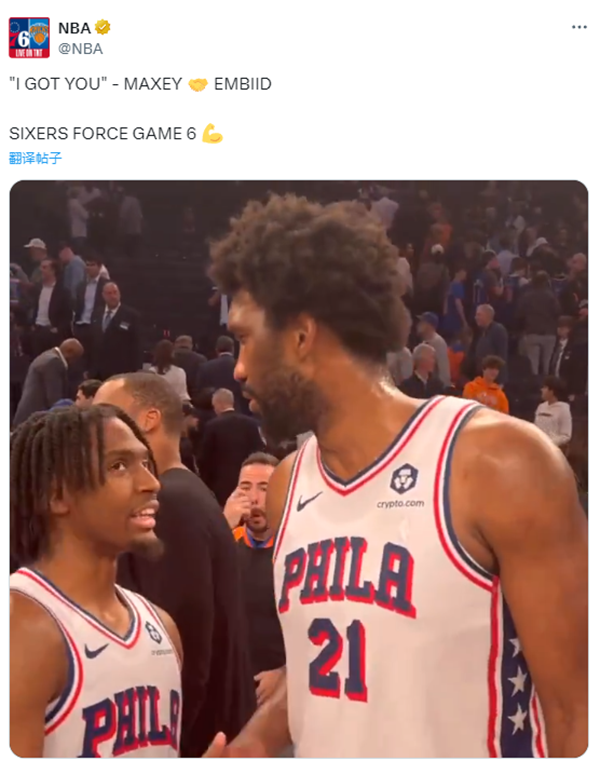76人G5赢球后,马克西和恩比德握手,并且表示:你还好吗?我们还差2场胜利,我支持你,加油;今日一战,恩比德19投7中拿到19分16篮板10助攻5盖帽9失误,状态糟糕还被客场球迷辱骂,赛后马克西鼓励并且力挺大帝。