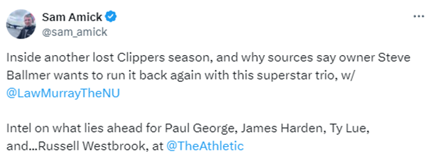 名记SamAmick撰文报道了快船的休赛期前景,报道称NBA最富有的老板鲍尔默愿意继续花钱保留所有核心;尽管快船最近的表现令人失望——继2022年无缘季后赛后,他们连续第二年在首轮出局——但他们预计会努力重新签下保罗-乔治和詹姆斯-哈登。