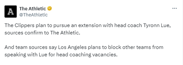 快船计划与泰伦-卢续约,他们计划阻止任何其他球队与卢指导谈论关于主帅一职的话题,据此前报道,湖人有意卢帅,但目前来看,湖人挖墙脚的希望渺茫。