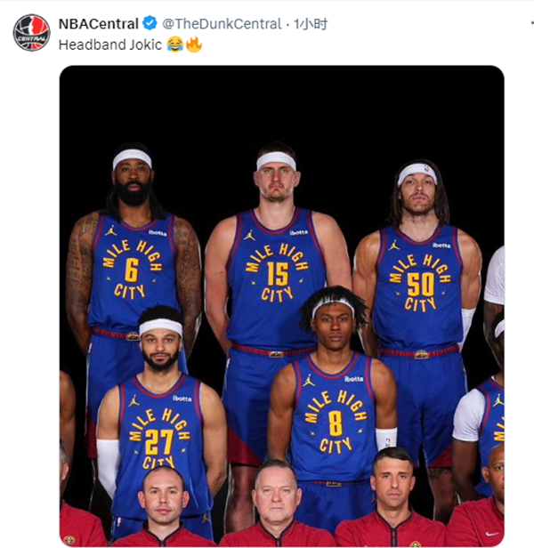 在掘金全家福合影上,掘金教练组成员全都坐在第一排,主教练迈克-马龙坐在C位,凸显球队地位;掘金众将全都佩戴发带且满脸严肃。