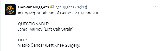 掘金官方公布西部半决赛G1伤病报告,穆雷(左小腿拉伤)出战成疑,钱查尔(左膝手术)继续缺席比赛。