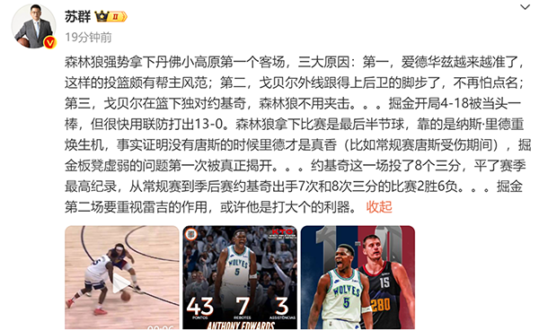 期待接下来爱德华兹的发挥,如果可以再赢下G2的话,那么晋级西部决赛的可能性将倍增。同时可以预料的是接下来的爱德华兹会遇到更大的考验和防守强度,期待他届时的表现。