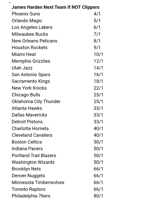 若离开快船队,哈登下家赔率详情——1、太阳4/1;2、魔术5/1;3、湖人6/1;4、雄鹿7/1;5、鹈鹕8/1;6、火箭9/1;7、热火10/1;8、灰熊12/1;9、爵士14/1;10、马刺16/1;11、国王18/1;12、尼克斯22/1;13、公牛雷霆25/1;14、老鹰、独行侠和活塞33/1;15、黄蜂和骑士40/1;16、凯尔特人、步行者、开拓者和骑士50/1;17、篮网、掘金、森林狼和猛龙66/1;18、76人80/1