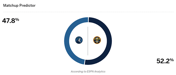 目前森林狼总比分1-0领先掘金,根据赛程,两队G2将在5月7日上午10点开打,ESPN预测G2胜率——森林狼47.8%和掘金52.2%,美媒看好掘金扳回一城。