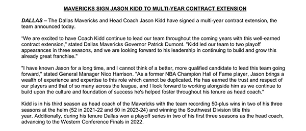 独行侠总裁杜蒙特表示:我们很高兴基德在未来的几年内继续带领球队,我们期待着他的领导,继续建设和发展我们这支伟大的球队。