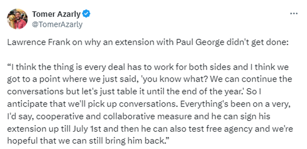 今日快船总裁劳伦斯-弗兰克谈到为何与乔治的续约没有完成,他表示:我认为每一笔协议都必须对双方都有效,我认为我们已经到了这样一个地步,我们只是说,‘你知道吗?我们可以继续对话,但让我们把它摆到年底。’所以我预计我们会继续对话。我想说,一切都是非常合作和协作的,他可以签署续约合同,直到7月1日,然后他也可以试水自由球员市场,我们希望我们仍然可以把他带回来。