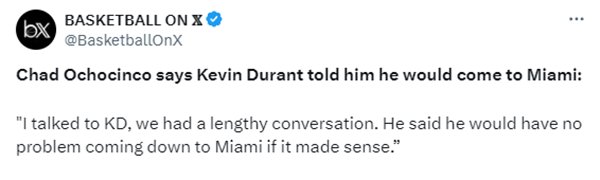 JRS直播网讯 北京时间5月8日,太阳三巨头真要解体吗?据报道,杜兰特愿意加盟迈阿密热火;查德-奥乔辛科透露,杜兰特告诉他他愿意来迈阿密,直言: 我和 KD 谈过了,我们进行了长时间的交谈。他说如果合适,他愿意加盟迈阿密(热火)。