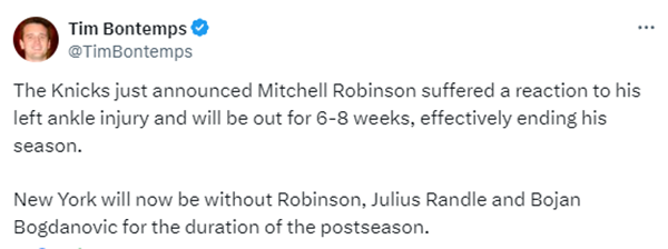 JRS直播网讯 北京时间5月8日,纽约尼克斯官方宣布,米切尔-罗宾逊遭遇左脚踝应力性损伤,他将在6-8周后接受复查,如果按6周来算,米切罗复出时间则是6月19号,这意味着米罗因伤提前赛季报销。