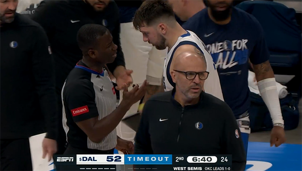 第二节东契奇休息时膝盖上绑着厚厚护具,9分56秒卢卡重新上场,小哈达威抛投命中,东契奇助攻华盛顿命中三分,莱夫利吃饼暴扣,亚历山大得分止血,华盛顿再中三分,东契奇抛投命中有被犯规的嫌疑,东契奇带队14-2拉开分差,暂停期间东契奇不满判罚,与裁判进行一番沟通。