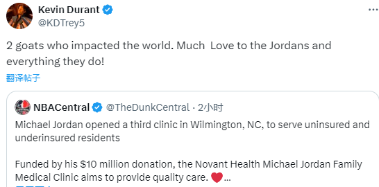 JRS直播网讯 北京时间5月11日,据美媒报道,61岁的迈克尔-乔丹再次捐款1000万美元用于开设健康诊所,乔丹善举引热议,杜兰特发推盛赞:两个GOAT都影响了世界。