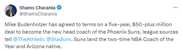 2023-24赛季,在沃格尔的执教下,杜兰特、布克和比尔三巨头带队征战却在首轮被森林狼4-0横扫,经过一番商讨之后,最终太阳于昨天正式解雇沃格尔,沃格尔下课仅仅过了一天,太阳就火速敲定新帅,已经和前雄鹿冠军教头布登霍尔泽签下5年超5000万美元大合同。