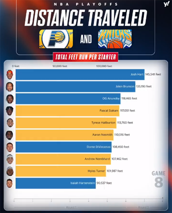 JRS直播网讯 北京时间5月11日,联盟第一铁人约什-哈特创造一项NBA历史第一纪录,据美媒统计,过去8场比赛,哈特跑了145541英尺,也就是27.56英里,约为44.35公里,哈特的跑动距离已经达到马拉松级别,成为该纪录历史首人。