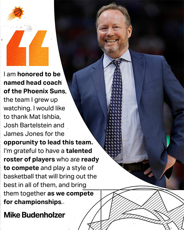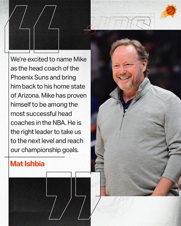 太阳老板马特-伊什比亚表示:我们很高兴任命迈克为菲尼克斯太阳队的主教练,并把他带回他的家乡亚利桑那州。迈克已经证明了自己是NBA最成功的主教练之一。他是带领我们进入下一个阶段并实现我们的冠军目标的合适领袖。