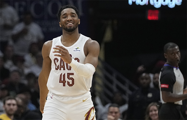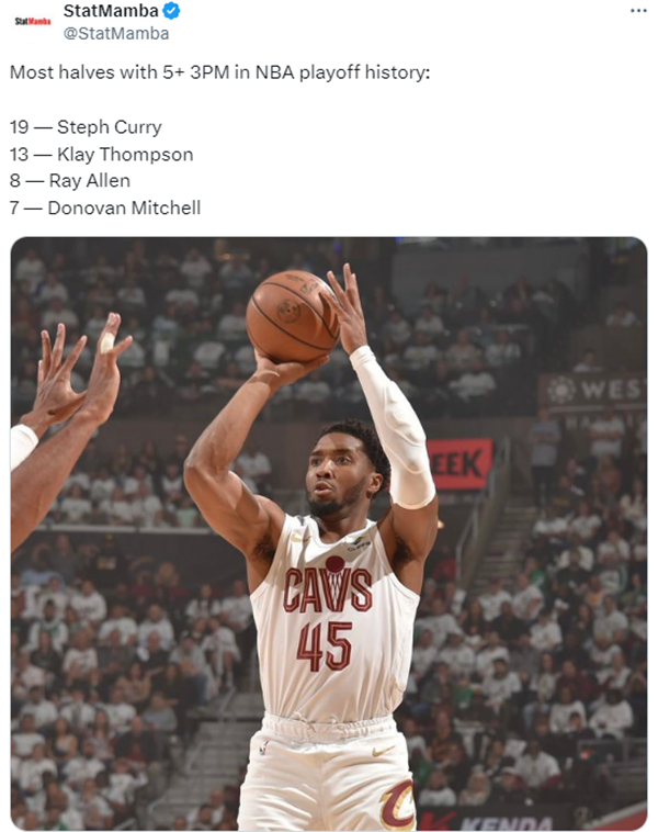 上半场,米切尔12投8中、三分8中6独砍23分,季后赛生涯第7次半场至少命中5记三分,仅次于库里、汤普森和雷-阿伦排在历史第4位。