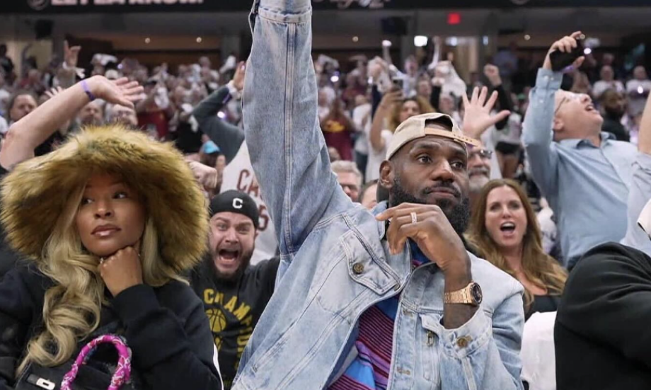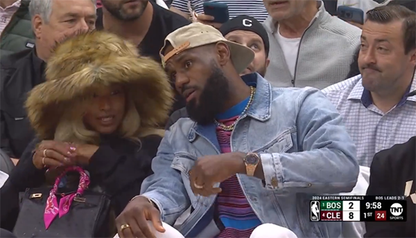 39岁的詹姆斯反戴棒球帽、身穿牛仔外套和白色长裤,戴着名表和金戒指,脖子上戴着大金链子,穿金戴钻豪气十足;萨瓦娜戴着一顶十分抢镜的帽子,詹姆斯走进球馆时,现场球迷起立鼓掌欢迎勒布朗;詹姆斯夫妇闲聊时,老詹主动凑过去倾听。