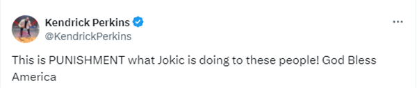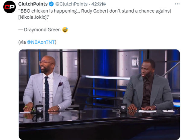 做客TNT的追梦格林实时点评比赛,表示:我是一个说实话的人,现在的事实是,戈贝尔在与约基奇的对抗中毫无胜算。NBA名嘴帕金斯发推表示:约基奇一直在惩罚这些人,上帝保佑美国。