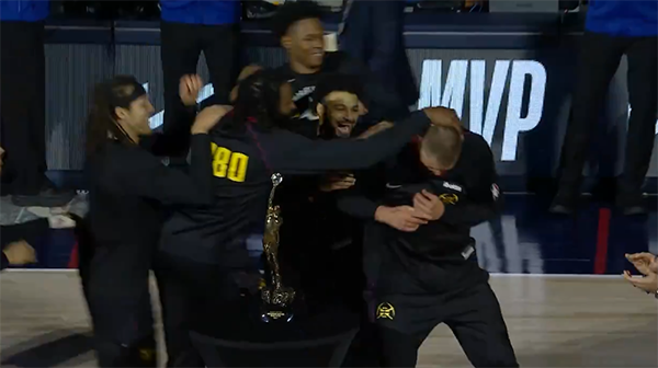 在掘金和森林狼天王山赛点战开打前,约基奇正式领取他的常规赛MVP奖杯(迈克尔-乔丹奖杯),联盟总裁萧华亲自为约基奇颁奖,现场球迷欢呼祝贺,掘金众将也为约基奇疯狂庆祝。