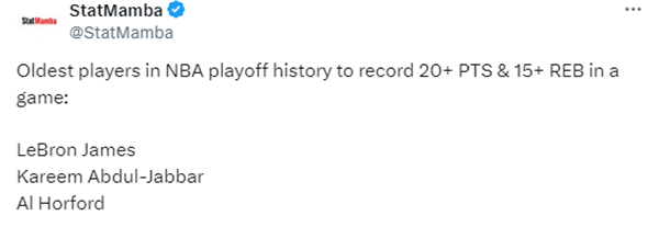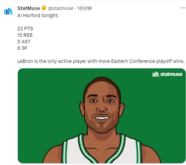 4、霍福德是NBA历史上第三位以37岁或更老的年纪在季后赛中单场砍下至少20分15篮板5助攻的球员。前两位是詹姆斯和贾巴尔。