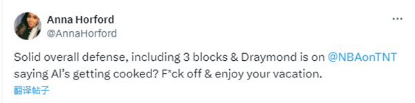 37岁霍福德在东部半决赛晋级之战中立大功,成为绿军4-1淘汰骑士的最大功臣之一,不过勇士球星追梦被骂惨了,霍福德的妹妹Anna Horford更推写道:全面稳固的防守,三个盖帽,追梦格林却在TNT上说我哥哥被打爆了?你赶紧滚啊,去享受你的假期吧。追梦格林就是个软蛋黑子。有偏见的解说就是软弱。让他从TNT滚吧。
