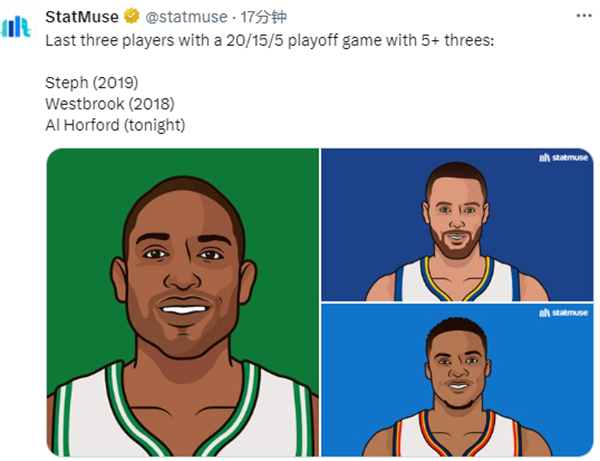 2、霍福德季后赛单场砍下至少20分15篮板5助攻且至少命中5记三分,比肩库里和威少