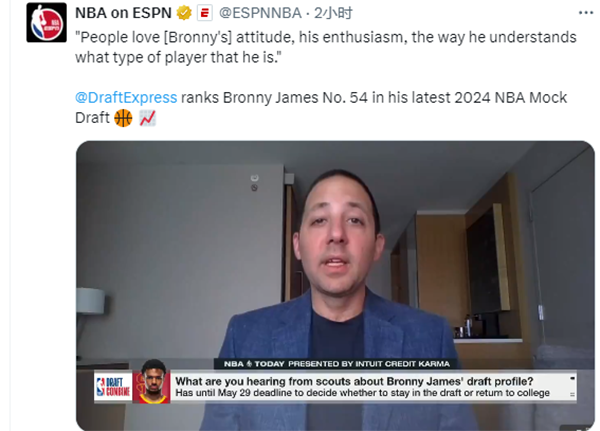 NBA选秀分析师Jonathan Givony报道,这次的联合试训对布朗尼来说特别有利,最新一次的预测中,我们将他排在了二轮的末段,第54顺位。他向人们证明了他有能力进入NBA,而不仅仅是在靠他爸詹姆斯作秀。他第一次五打五没有表现得很好,但是在第二场比赛中,他的防守,他的投射能力,帮助他的球队赢球。大家喜欢他表现出来的态度、他的热情以及他如何了解自己是哪种类型的球员。