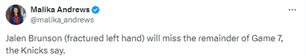 JRS直播网讯 北京时间5月20日,尼克斯主场抢七不敌步行者,总比分3-4被淘汰出局,纽约惨烈出局,布伦森拼到左手骨折,哈特带伤拼到犯满毕业,阿努诺比火线复出强忍5分钟便无奈退赛。