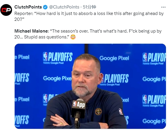 赛后记者问:“在领先20分的情况下被逆转,要吞下失利苦果有多难?”马龙表示:“下一个问题吧哥们,赛季结束了。这就是艰难之处,去TM领先20分,赛季结束了。你们不懂吗?赛季结束了,这很艰难。傻X问题。