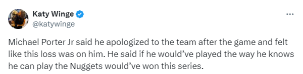 谈到本场失利,小波特表示:赛后我向全队道了歉,这场失利是我的锅。此外,小波特表示如果他能发挥正常水平,掘金就会赢得这轮系列赛。