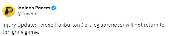 JRS直播网讯 北京时间5月24日,NBA东部决赛第二场,步行者又遭打击,球队官方宣布,核心球星哈利伯顿因左腿酸痛而提前退出比赛。