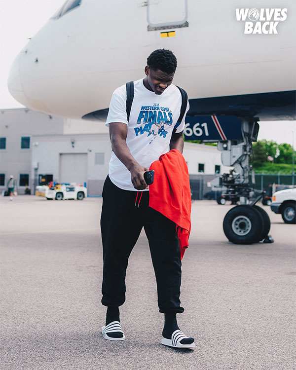 爱德华兹穿着拖鞋和运动裤、背着双肩包且拿着红色外套出镜,登机时满脸愁容;在西决系列赛前两场比赛,爱德华兹16投6中拿到19分11篮板8助攻和17投5中拿到21分7助攻5篮板,末节一度累得戴氧气面罩,西决G2关键时刻致命失误葬送好局,森林狼惨遭18分大逆转,而且被东契奇三分准绝杀。