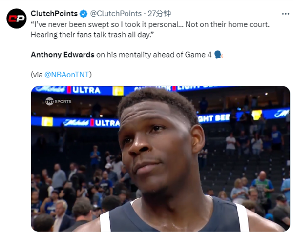 赛后接受采访,爱德华兹表示:尽管我们已经输了三场,但我从未被横扫过。所以我把这看成了个人恩怨。我不想回家,我不想被横扫,我绝对不想被横扫,不管是主场还是客场(今天森林狼客场)。所以我认为我们今天打出来了,我们打出了一场高水平的比赛。