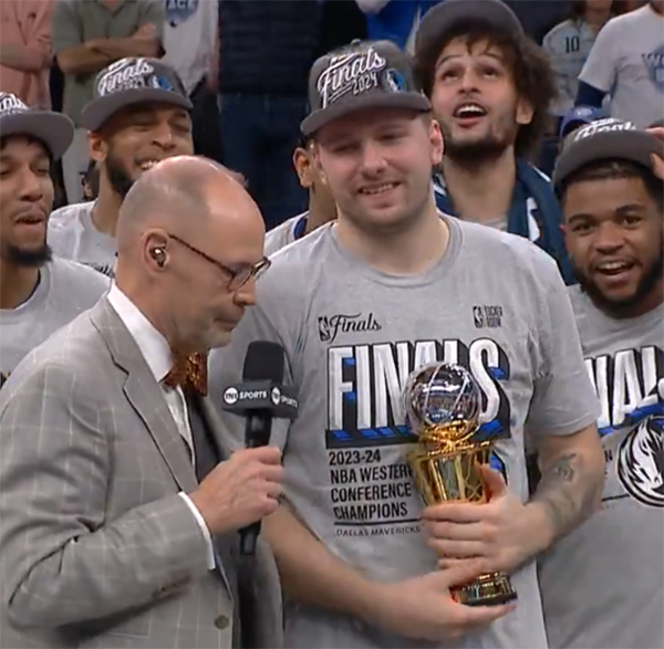 G5晋级之战,东契奇(右膝扭伤、左脚踝酸痛)继续带伤出战,全场22投14中轰36分10篮板5助攻,打出疯狂一战从而终结系列赛,带领球队绅士横扫森林狼;东契奇荣获西决MVP,高举奖杯大笑庆祝,全队为他欢呼呐喊。