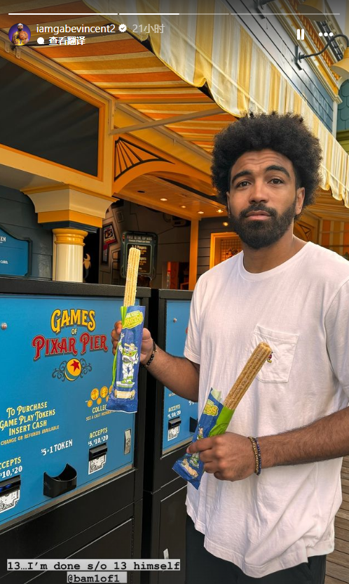 湖人后卫文森特通过社交媒体晒出自己在洛杉矶迪士尼乐园逛吃逛喝的画面,留着爆炸头发型、戴着墨镜游玩,期间文森特一直在吃西班牙油条,吃掉地13根后,文森特发文调侃前队友阿德巴约,写道:13根了,我不吃了。致敬13号本人@阿德巴约。