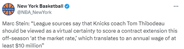 据Marc Stein报道,锡伯杜肯定会在休赛期和纽约尼克斯队以“市场价”续约,这意味着他的年薪至少为1000 万美元。