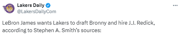 “美国杨毅”A-史密斯公开表示:让我告诉你我还听到了什么,勒布朗-詹姆斯正试图让洛杉矶湖人队以第二轮选秀权选中布朗尼-詹姆斯。他还希望JJ-雷迪克成为他的下一任主教练。我只是告诉你我听到的。