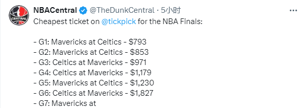 根据赛程,独行侠和凯尔特人总决赛G1将在6月7日上午8点30分开打,本场比赛的最低票价为793美元;另外几场总决赛的最低票价分别是G2-853美元、G3-971美元、G4-1179美元、G5-1230美元、G6-1827美元、G7-1737美元。