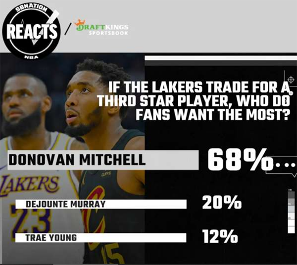 JRS直播网讯 北京时间6月3日/讯近日美媒SilverScreenandRoll面向湖人球迷进行了一项休赛期前瞻调查,如果湖人交易得到队内第三位球星,湖人球迷希望那个人是谁?多诺万-米切尔68%,德章泰-穆雷20%和特雷-杨12%。