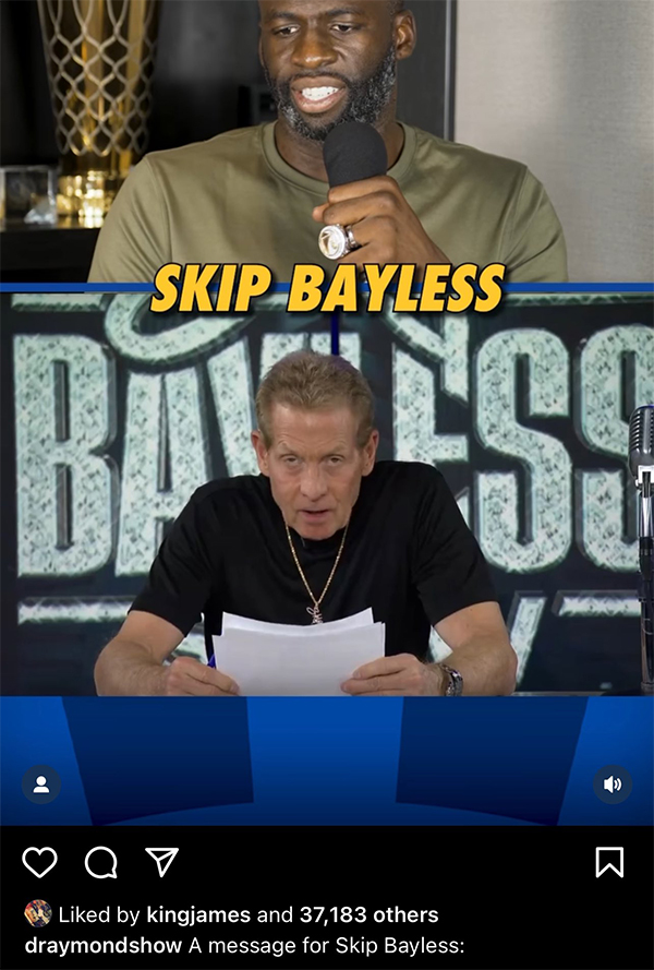 JRS直播网讯 北京时间6月6日,勇士球星追梦格林公开怒怼“全美第一詹黑”斯基普-贝勒斯,直言:你的节目已经完蛋了,没人想听你说话了;对此詹姆斯点赞力挺,库里也发声力挺追梦。