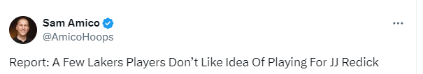 JRS直播网讯 北京时间6月9日,湖人选帅备受关注,据NBA记者John Fanta报道,湖人队有几名球员不喜欢为JJ-雷迪克效力;名嘴帕金斯表示选赫尔利是为了浓眉和湖人的未来,并不是为了詹姆斯。