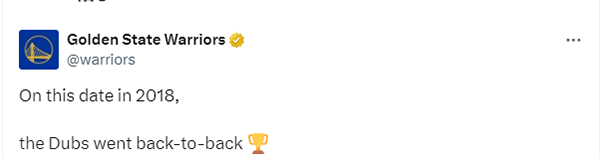 在勇士6年前的夺冠大合影中,杜兰特比出两连冠的手势并且抱着FMVP奖杯,库里则是抱着总冠军奖杯,汤普森、麦基、尼克杨等人开心庆祝,两个小朋友举着杜兰特和库里击掌的“勇士王朝”海报十分抢镜。