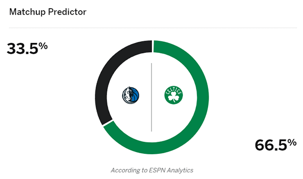 根据赛程,总决赛G2将于明天上午8点开打,今日ESPN更新总决赛第二场的胜率——凯尔特人从66.4%变成66.5%,独行侠从33.6%变成33.5%,很明显美媒仍旧看好绿军在主场拿下G2。