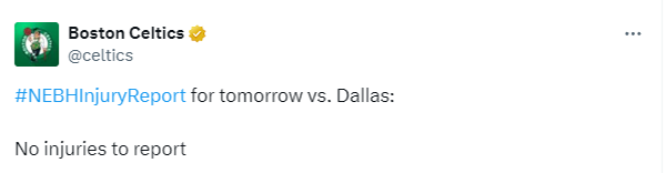 独行侠和凯尔特人两队仅仅只有东契奇一人在伤病名单上,今年季后赛至今,东契奇一直备受膝伤和脚踝伤势的困扰,预计他将会继续带伤出战;总决赛首秀,东契奇带伤轰下30分10篮板仍遭遇惨败,提前5分钟放弃比赛。