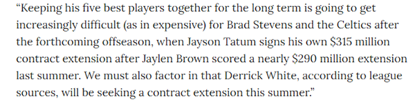 Marc Stein报道称,对于布拉德-史蒂文斯和凯尔特人来说,在即将到来的休赛期,让他最好的五名球员长期团结在一起将变得越来越困难(因为代价高昂);去年夏天杰伦-布朗获得5年2.9亿美元大合同,今夏塔图姆有资格续签5年3.15亿美元超级顶薪,怀特今夏将寻求续约。