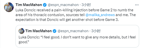 今年季后赛至今,东契奇一直带着膝伤和脚踝酸痛的伤病坚持比赛,总决赛G1意外撞伤胸部,G2仍旧忍痛坚持;据名记Tim MacMahon报道,消息人士透露,卢卡-东契奇在第二场比赛前接受了止痛注射,以麻痹他胸部挫伤的区域,预计东契奇在第三场比赛前会再进行一次注射。